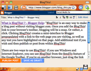BlogThis is a great tool!! Its such an easy shortcut. This tool allows one to click on a link that pops open a window that links the page that your currently on. You can blog about it and then it goes directly to the blog. A downer to this shortcut is that it doesn't allow you to upload a photo on that window. You can change it when you log back on to your original blog. This is a great easy and quick tool. Want to try it?